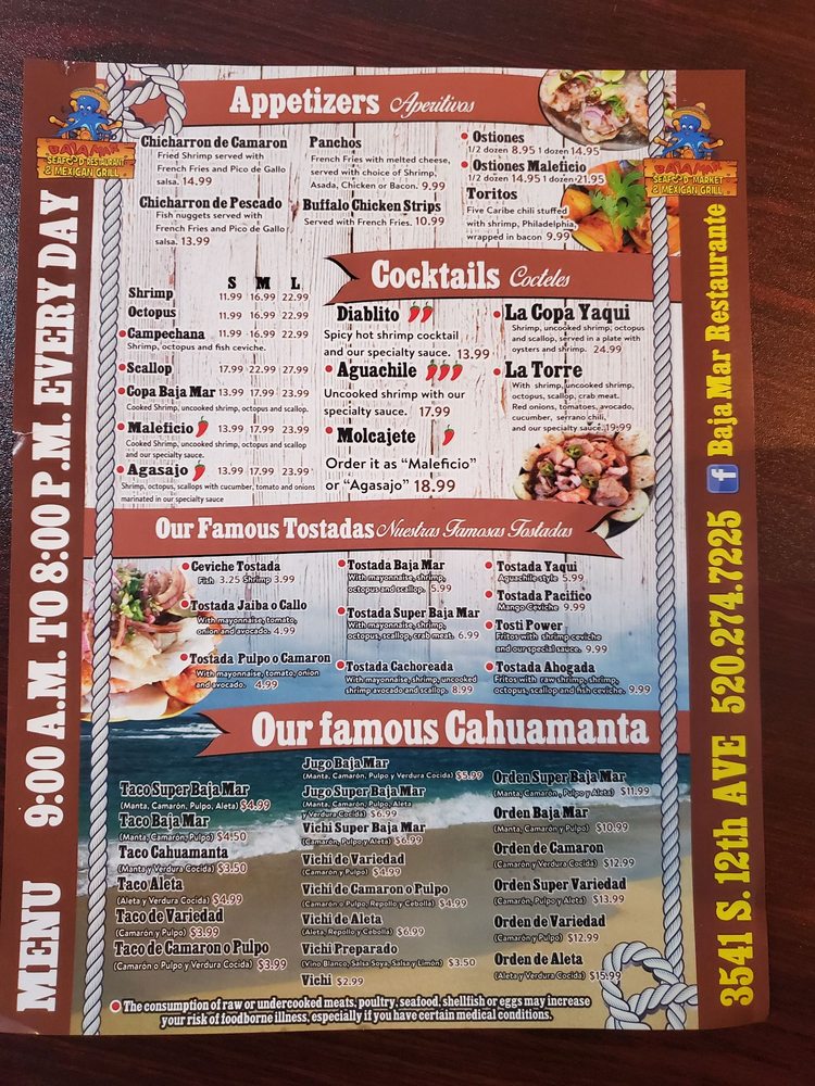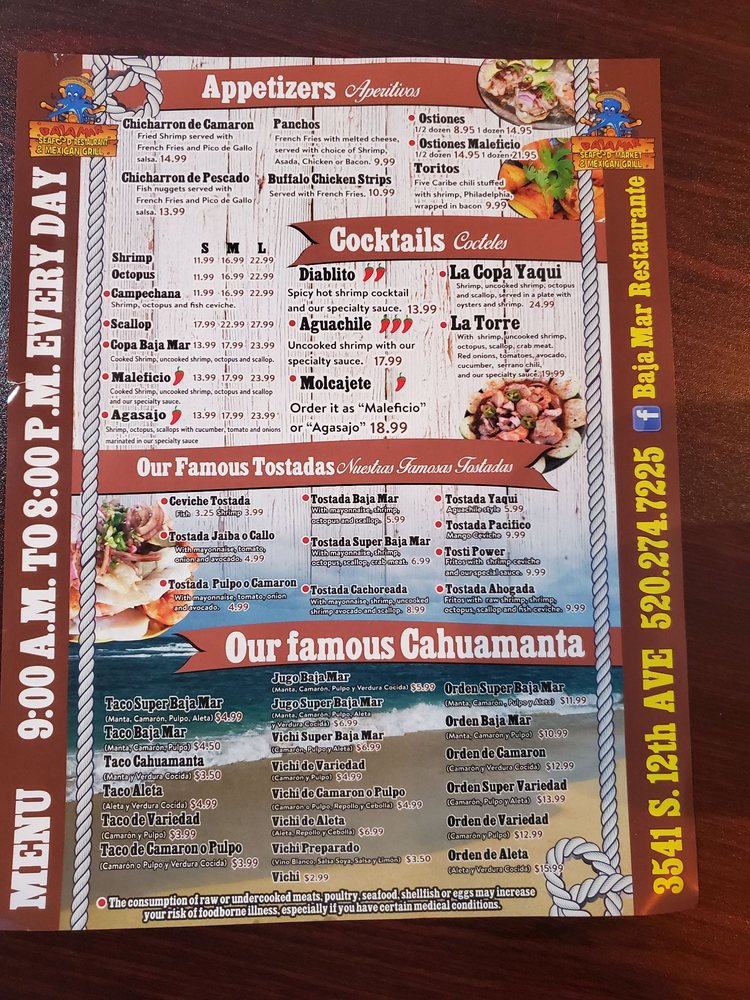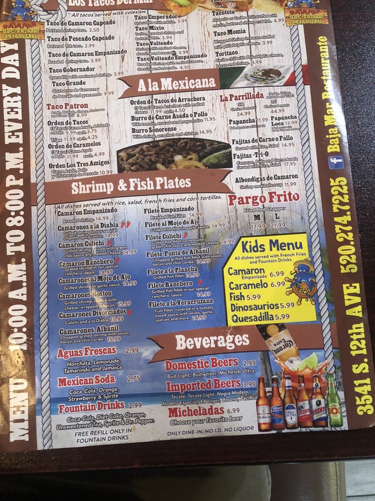 Welcome to Baja Mar Restaurante, a vibrant culinary escape located at 3541 S 12th Ave, Tucson, AZ. This gem specializes in a fusion of Italian flair and coastal delights, masterfully blending flavors to create a unique dining experience. The menu offers a tantalizing array of options, including the mouthwatering Los Tacos del Mar featuring carne asada or shrimp quesadillas, perfect for seafood enthusiasts.
